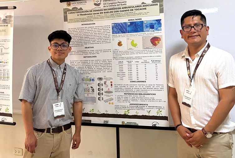 Representando a nuestra Facultad asistieron el Dr. Bernabé Salomón Luis Alaya, docente del Departamento Académico de Microbiología y Parasitología, y Abel Gonzalo Pichen Anhuamán, estudiante de la Escuela Profesional de Ciencias Biológicas. Ambos participaron como autor y coautor, respectivamente, del póster científico titulado: “Caracterización de hongos micorrízicos arbusculares asociados a Theobroma cacao en suelos con cadmio de Tocache”.