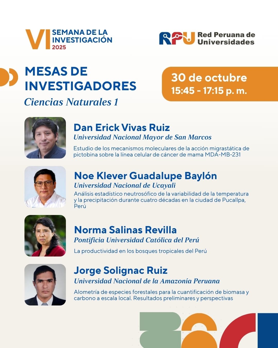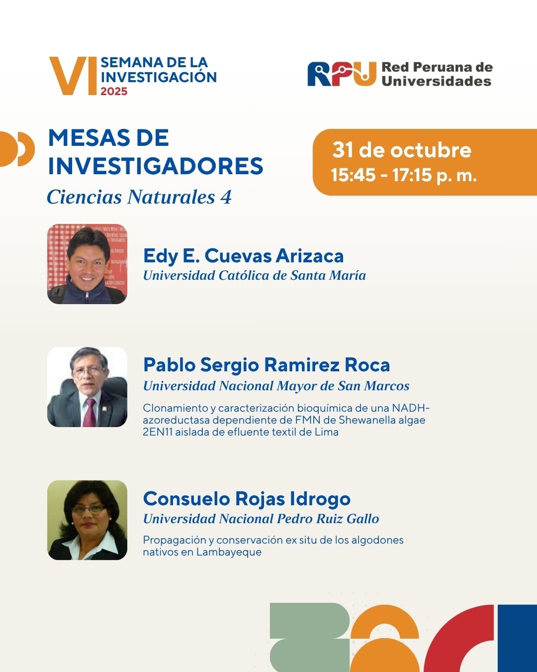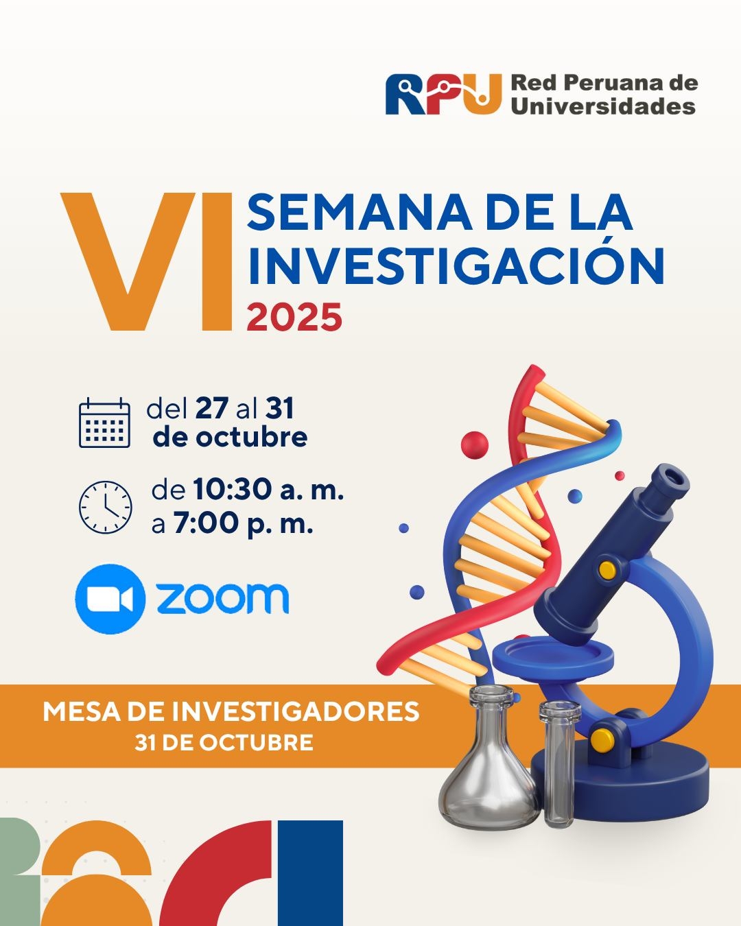La Red Peruana de Universidades invita a participar en las Mesas de Investigadores – Ciencias Naturales, en el marco de la VI Semana de la Investigación 2025, donde la Universidad Nacional Mayor de San Marcos tendrá una participación protagónica a través de investigadores de la Facultad de Ciencias Biológicas, quienes presentarán avances científicos de alto impacto internacional.